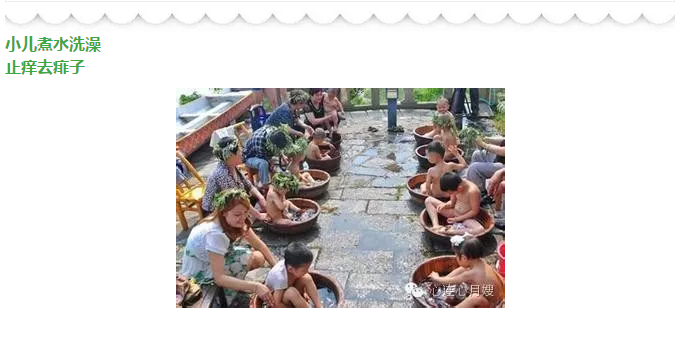 可以隔三差五的给宝宝煮艾草水洗,不仅止痒去痱子,连蚊虫叮咬的地方也好了,皮肤滑滑的! 如果宝宝,脖子下面,腋下,私处的痱子化脓了,也不要怕,可以洗干净后,用芝麻油调艾草灰给宝宝涂抹,第二天就好!实际上在夏天,男女老少都可以用艾草煮水洗澡的,去汗味也不错。特别是产妇,用艾草煮水洗澡除了去恶露不尽,还可以行气活血,夏天产妇洗澡水温不要太热,大汗不好。